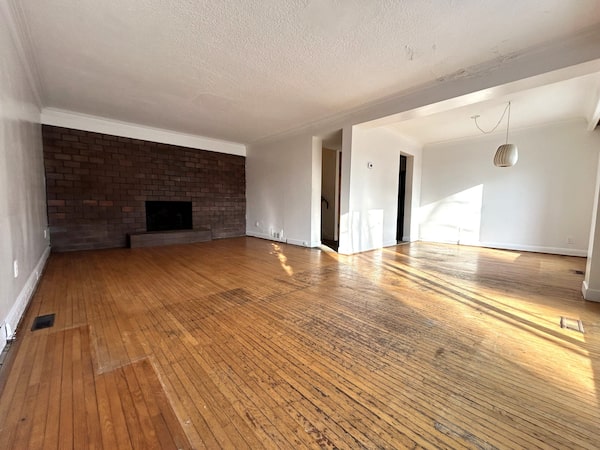 The living room has a fireplace and is connected to a dining area.