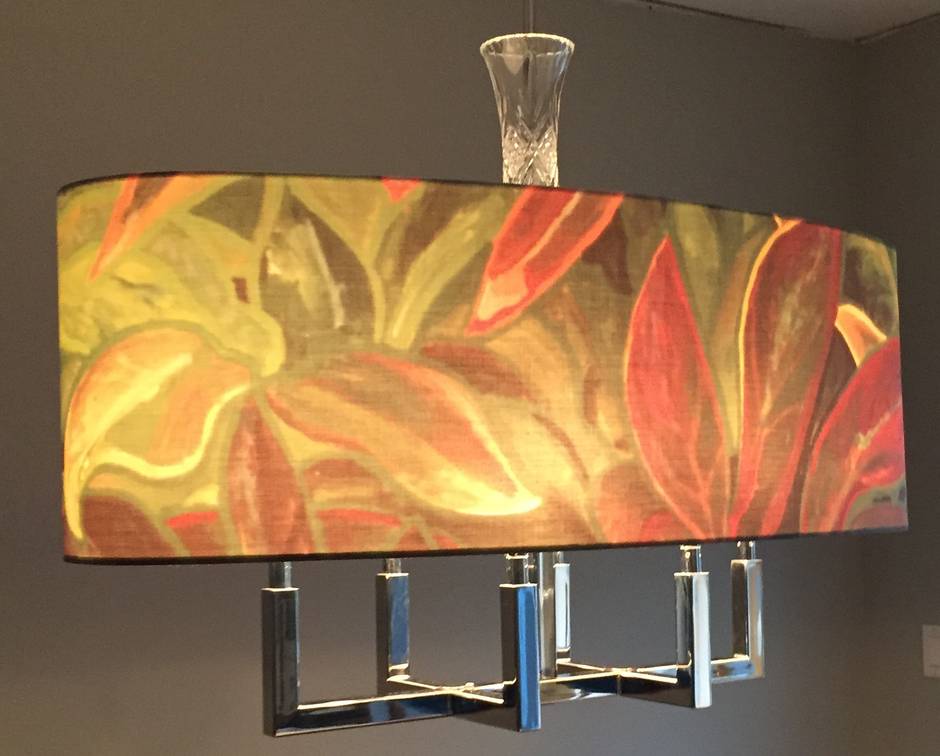One of his oval light fixtures hangs overhead, casting a warm glow. The shade has an overall fall pattern; hypnotic swirls of oranges, reds, faded green and plum.
