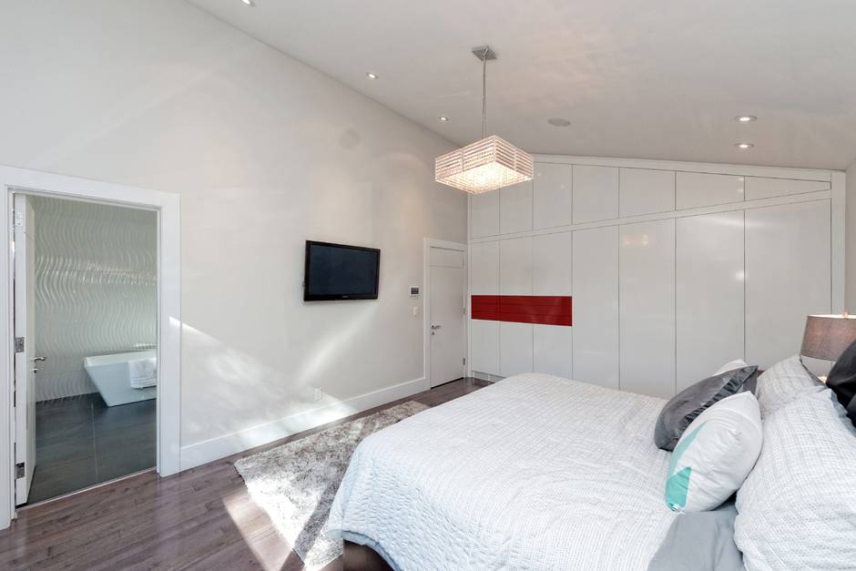 A glass bridge leads to the master bedroom, which has an ensuite bathroom with a freestanding tub and his-and-hers vanity.