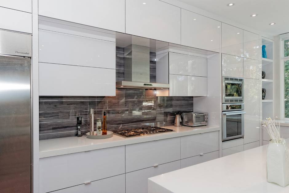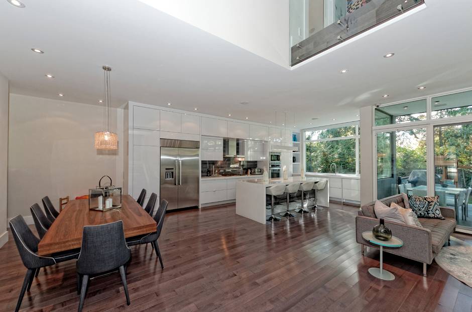 The modern kitchen, with sleek white cabinets, has a large island and a wall of windows overlooking the backyard.