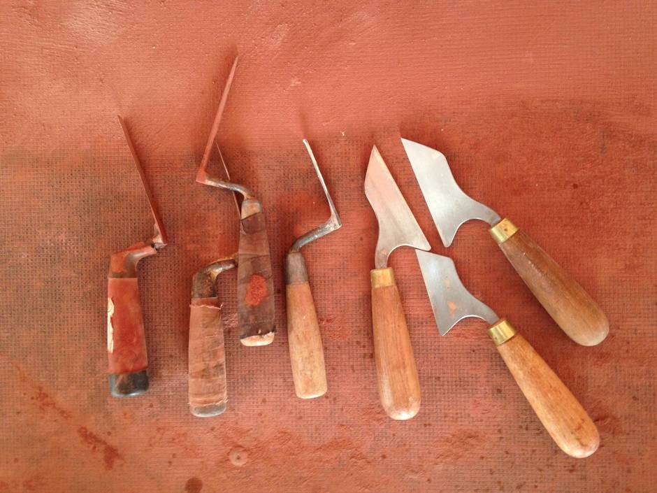Before the stopping mortar is dry, a straightedge is used to carve a groove (called a scribe or housing) down the centre. It is into this channel that the bright, lime putty ribbon is "tucked in," slowly, with a tuck iron. While it's still soft, a "frenchman" (ribbon knife) is used to carve away excess to create the crisp, straight line.