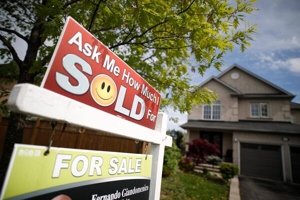 A real estate sign that reads ‘For Sale’ stands in front of housing in Vaughan, a suburb in Toronto on May 24, 2017.MARK BLINCH/Reuters