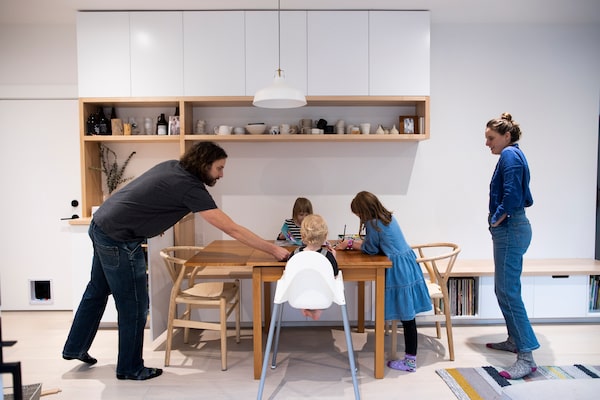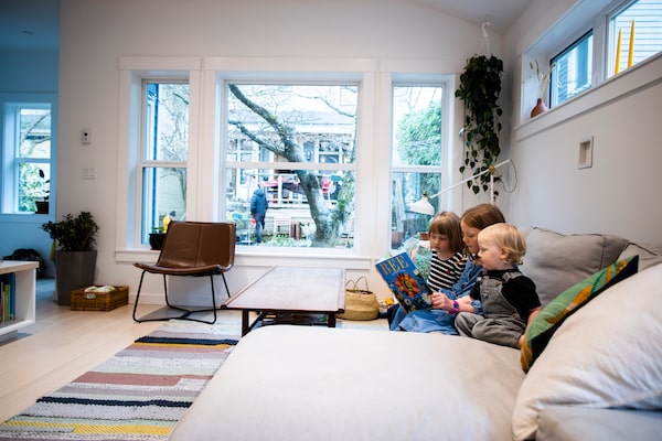 Brad Hutton and Ariel Ward spend time with their kids Kajsa, 7, right, Maeve, 4, left, and Marlo, 1, middle, inside their laneway house.Rafal Gerszak/The Globe and Mail