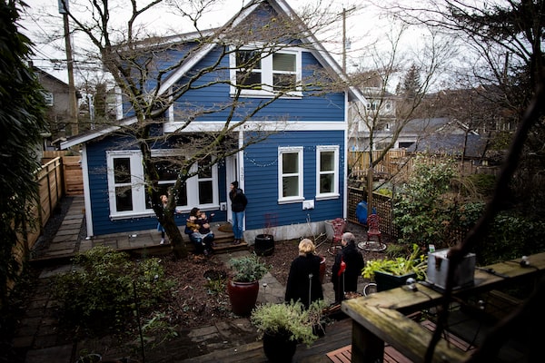 Frances Bula, left, and her partner Doug Ward, right, hang out with their family in the backyard between their house and the laneway house in Vancouver on Jan. 9, 2021.Rafal Gerszak/The Globe and Mail