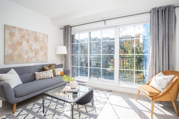 This one-bedroom, 615-square-foot unit is in a four-year-old building on the east side, close to the Hastings Sunrise neighbourhood. It features a brick façade, overheight ceilings, galley kitchen, large quartz-topped island, floor-to-ceiling windows, ensuite laundry and a bedroom area closed off by partitions. It’s on a busy street above retail and is a 10-minute bus ride to downtown.