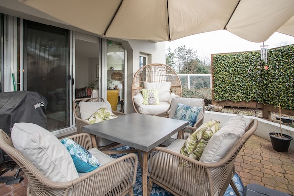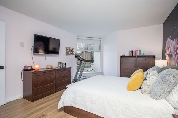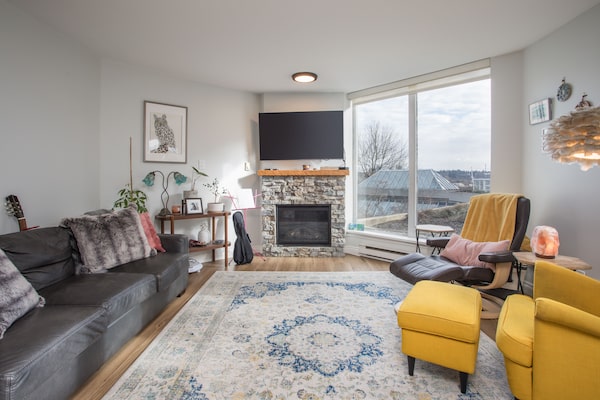 This ground-level condo is in the 33-year-old Palace Quay concrete tower near the Fraser River.