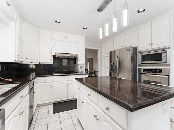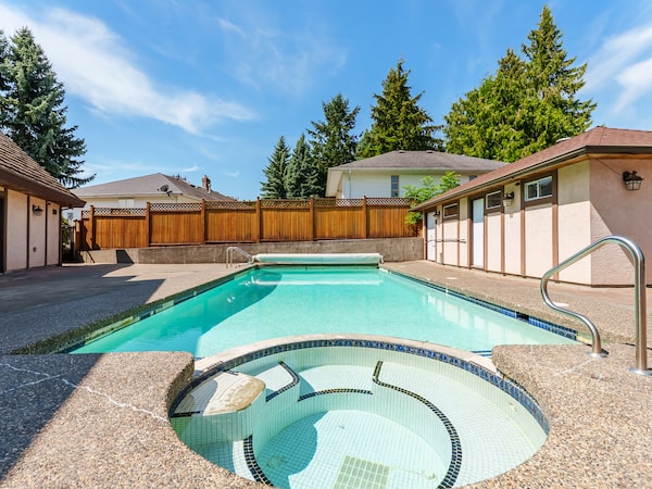 There is a heated pool, hot tub and cabana with a full bathroom in the private landscaped backyard.