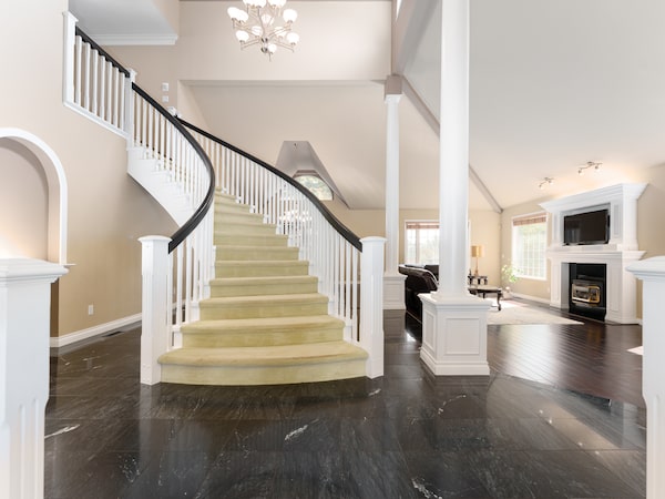 This 3,797-square-foot house sits on nearly a third of an acre on a hill in Surrey, B.C., with views of Mount Baker.Photography provided by Virtualized Studio