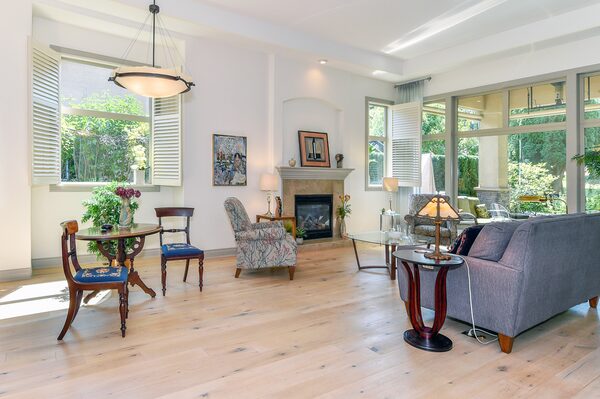 The house was partly renovated a year ago, with new flooring, top-end appliances and new paint. The two-bedroom, two-bathroom, air-conditioned 2,196-square-foot home is one level with high ceilings, floor-to-ceiling windows, fireplace, den with built-in shelves and a small basement for a wine cellar.
