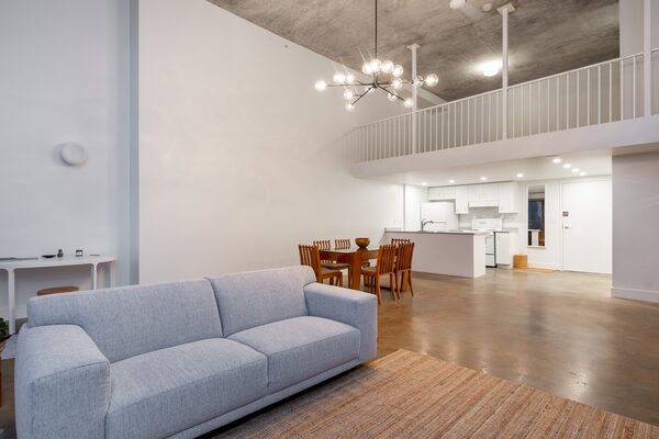 The two-level loft has 16-foot ceilings, concrete floors, an upstairs bedroom area and secured parking. The 985-square-foot unit is in a downtown tower built in 1996.