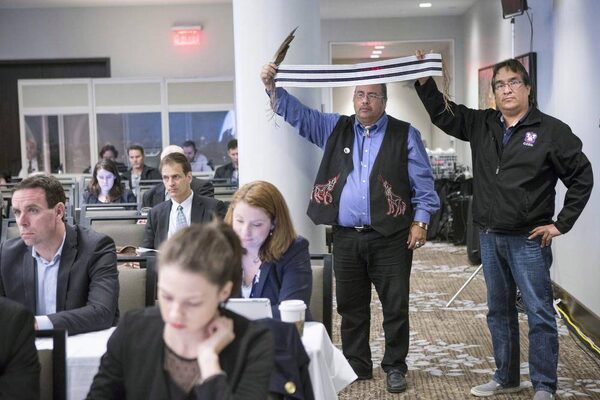 Band councillors from the Chippewas of the Thames First Nation hold aloft a two-row wampum belt during a hearing by the National Energy Board in Toronto on Oct. 16, 2013.CHRIS YOUNG/The Canadian Press