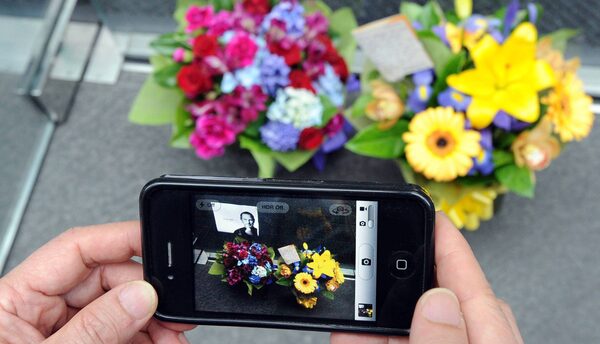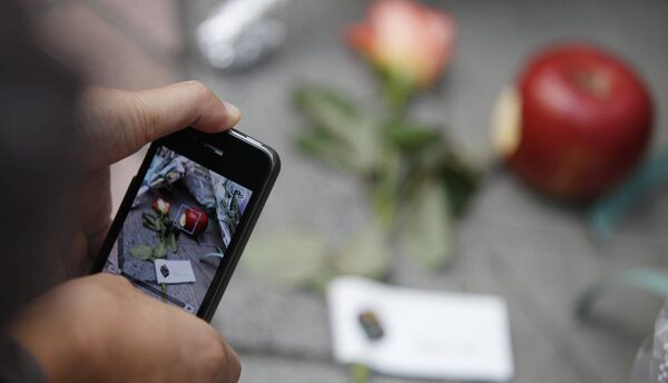 A passerby uses an iPhone 4 to photograph flowers left for the late Steve Jobs, co-founder of Apple, outside the Apple store in Sydney, Australia on October 6, 2011.Torsten Blackwood/AFP/Getty Images