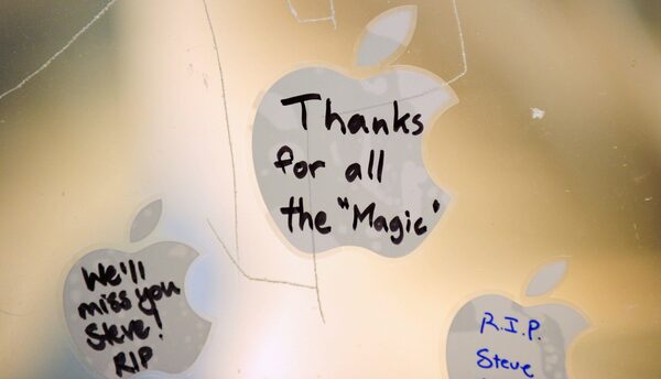 Messages on Apple stickers are left on the window of the Apple store in Pasadena, California, October 5, 2011.Robyn Beck/AFP/Getty Images