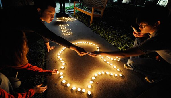 Chinese exchange students from nearby De Anza College use candles to create the Apple logo and Steve Jobs' last name in Chinese characters at a makeshift memorial for Steve Jobs at the Apple headquarters on October 5, 2011 in Cupertino, California.Kevork Djansezian/Getty Images