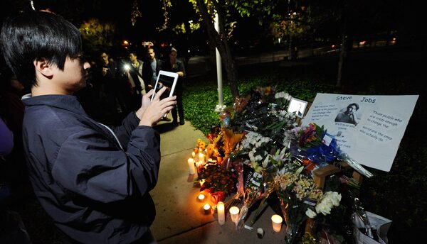 A crowd gathers at a makeshift memorial for Steve Jobs at the Apple headquarters on October 5, 2011 in Cupertino, California.Kevork Djansezian/Getty Images