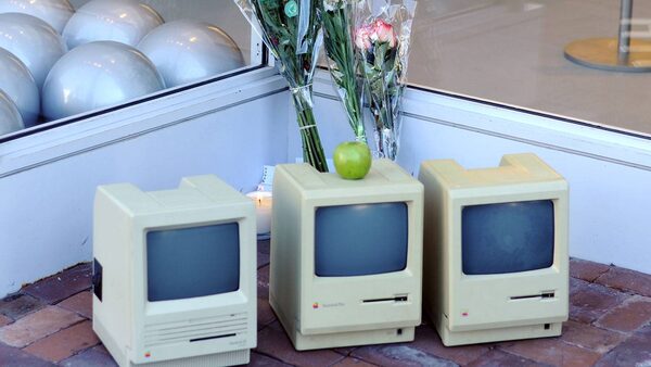 Early Macintosh computers and flowers are placed in front of the Apple Store in Washington on Oct. 6, 2011, one day after Apple co-founder Steve Jobs died at the age of 56 following a long battle with cancer.