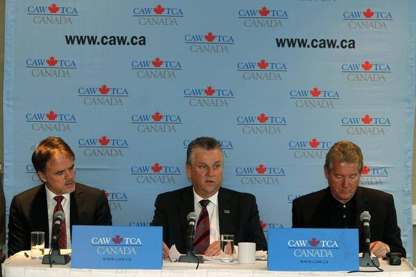 Canada Auto Workers economist Jim Standford, left, CAW president Ken Lewenza, centre, and CAW Secretary-Treasurer Peter Kennedy during a press conference in Toronto on April 16, 2012.Fernando Morales/The Globe and Mail