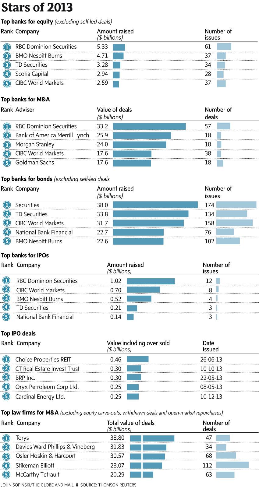 The rankings of banks for mergers and acquisitions were incorrect in an earlier version of this table. This version has been corrected to show that CIBC World Markets ranked fourth and Goldman Sachs fifth.