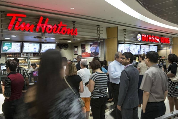 A Tim Hortons coffee franchise stands next to a Burger King outlet in a Toronto food court. Burger King are in talks to take over Tim Hortons in a deal which would create the world's third largest quick service restaurant chain, though the two food outlets would remain as stand alones.Photo: Chris Young for The Globe and MailChris Young/The Globe and Mail
