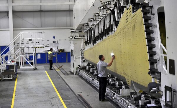 A worker shines a torch as he inspects rivets on a C Series airplane wing in the Bombardier factory in Belfast, Northern Ireland.CLODAGH KILCOYNE/Reuters