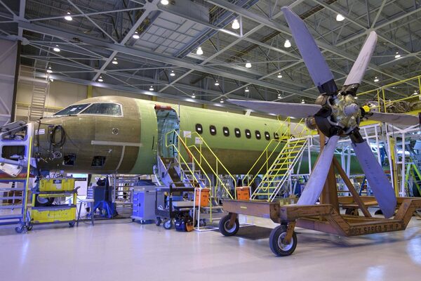 A Bombardier Q400 NextGen turboprop airliner sits under construction in one of the hangars at the Bombardier Aerospace plant at Downsview airport, in Toronto on Tuesday, April 6, 2010.Norm Betts