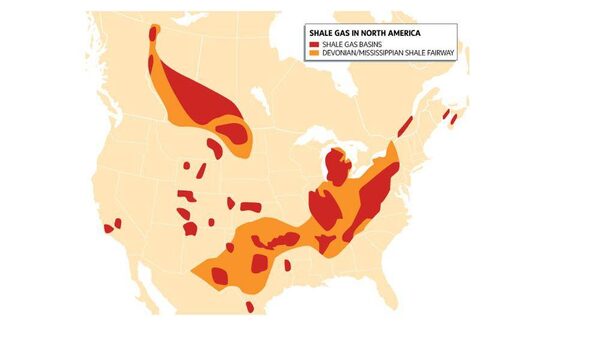The major shale gas plays of North America. In red, shale gas basins. In orange, Devonian/Mississippian shale fairway.