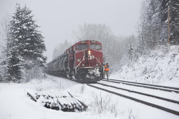 A worker steps off of a CP Rail train onto snow covered tracks near Malakwa, B.C., Dec. 22, 2015.JASON FRANSON/The Globe and Mail