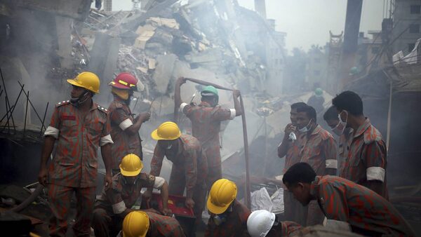 Workers and fire fighters are shrouded in smoke as they prepare to dislodge the debris and fallen ceiling of the garment factory building which collapsed in Savar, near Dhaka, Bangladesh on Monday, April 29, 2013.Wong Maye-E/The Associated Press