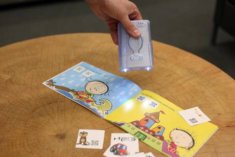 For example, with talking stickers, the child (or parent) could use a hand-held device to scan a bar code near, for example, a bright yellow star on the page of a nursery rhyme book to hear Twinkle, Twinkle, Little Star. By scanning over a differently programmed sticker with a bar code, the child or parent then could record their voices to practice their language skills. The stickers are not just in books; they can be placed on household items, which then become tools for the language development of young children.