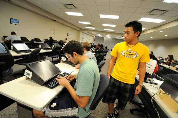 Michael Gorion, right, monitors students as they take exams at the University of Central Florida College of Business Testing Lab in Orlando in 2010.Steve Johnson/The New York Times