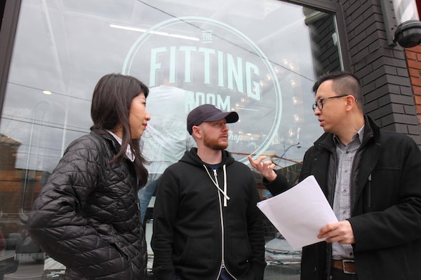 Rotman MBAs Sookie Ma, left, and Budianto Tandjono, right, have been working with local Toronto entrepreneurs, including Bryan Brock, centre, of the Fitting Room barbershop, to inject some ideas into their neighbourhoods.Jennifer Lewington/The Globe and Mail