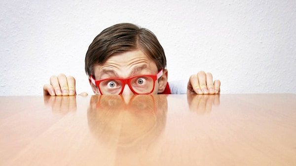 Scared nerd hiding behind a desk.NinaMalyna/Getty Images/iStockphoto