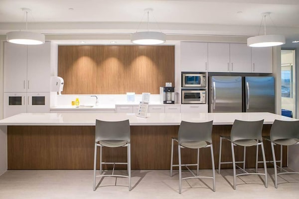 Each floor at the new Amex headquarters in Toronto features a “pantry” or kitchen space in addition to the main dining area, which provides subsidized healthy meals, a Tim Hortons kiosk and seating for up to 200 people.