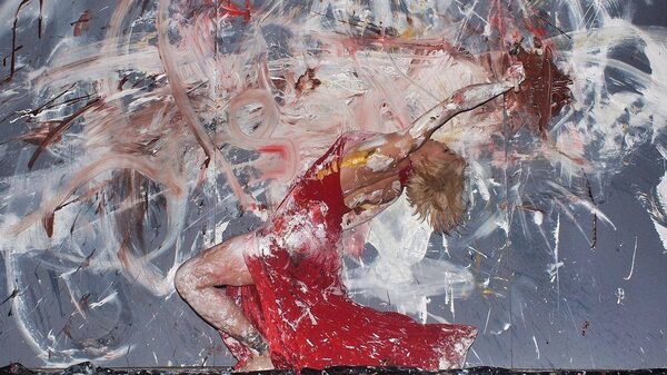 Canadian artist Pamela Masik creates art as part of a performance.