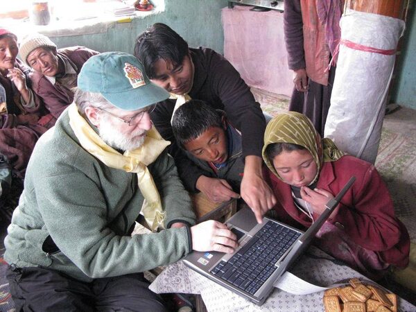 Donor Bryan Levman, one of the founders of of Give Kids a Chance, shows some young students how to use a laptop.