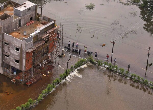 People gesture to an Indian coast guard helicopter for relief materials, in Chennai, India. Ideal Hope has also built 10 houses in an area affected by flooding.ANINDITO MUKHERJEE/Reuters