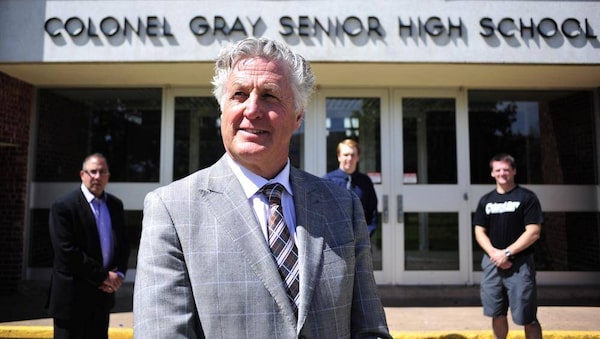 Danny Murphy, front, with fellow alumni Bill Dow, left, his nephew Stephen Cassidy, centre, and athletic director Chris Huggan outside Colonel Gray Senior High School in Charlottetown, P.E.I.Nathan Rochford