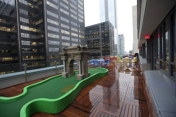 Many Google offices around the world have their own "quirky and unusual" features. Google's Kitchener-Waterloo office, which opened in mid-2011, featured a tube slide. It's an important part of office identity. "Google does have some guidelines – they're not standards, there's some flexibility," said Annie Bergeron, a lead at HOK, the local architectural firm that worked on the Toronto office. "… I was racking my brains for a feature that was cool, that has not been seen anywhere." After much debate, the crew settled on set of mini-golf putting greens outside on the the terrace – the perfect place for relaxing in summer, and even for bringing clients.
