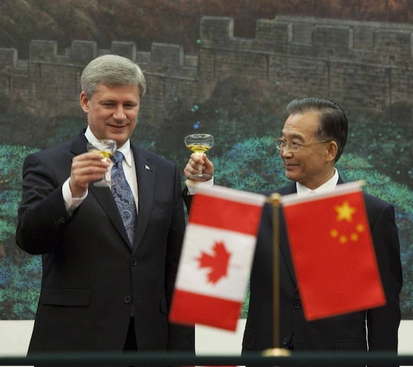 Prime Minister Stephen Harper takes part in a toast with Wen Jiabao, Premier of the People's Republic of China, following a signing ceremony at the Great Hall of the People in Beijing, China on Thursday, December 3, 2009.Sean Kilpatrick/The Canadian Press