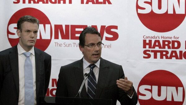 Pierre Karl Peladeau, right, president and CEO of Quebecor Inc., and Kory Teneycke, vice president of development of Quebecor Media, announce the companies' investment in the creation of a new English specialty channel called Sun TV News in Toronto on June 15, 2010.Reuters/Mike Cassese