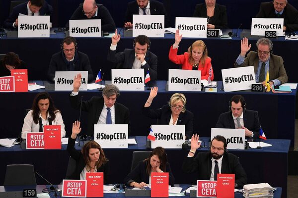 Members of the European Parliament take part in a voting session on the EU-Canada Comprehensive Economic and Trade Agreement in Strasbourg, France, on Feb. 15, 2017.FREDERICK FLORIN/AFP / Getty Images