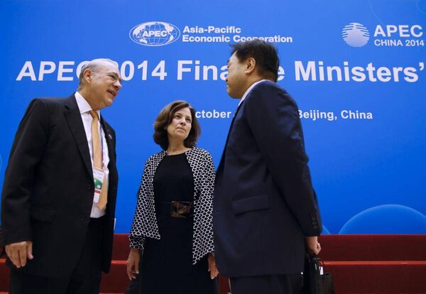 U.S. Deputy Treasury Secretary Sarah Bloom Raskin, center, chats with Angel Gurria, Secretary General of the Organization for Economic Co-operation and Development (OECD), left, and Philippines' Secretary of Finance Cesar Purisima before the opening ceremony of the Asia-Pacific Economic Cooperation (APEC) finance ministers meeting at the Diaoyutai State Guesthouse in Beijing, China Wednesday, Oct. 22, 2014.Andy Wong/The Associated Press