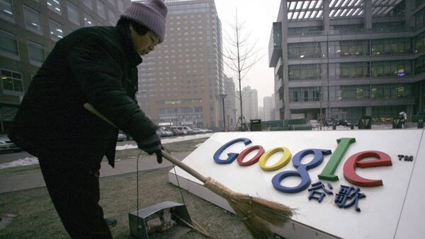 A cleaner sweeps the logo of Google China outside its company headquarters in Beijing, in this January 19, 2010 file photo. China's ambitions, and how they might be affected by the Google controversy, are likely to be a hot topic at next week's annual meeting of the World Economic Forum in Davos.ALFRED JIN