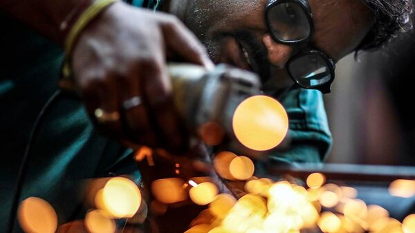 Sparks fly as an employee uses an angle grinder inside an Ishwar Engineering Co. factory in Mumbai, Maharashtra, India. The International Monetary Fund is predicting India will next year grow faster than each of its BRIC counterparts for the first time since 1999. Photographer: Dhiraj Singh/BloombergDhiraj Singh/Bloomberg