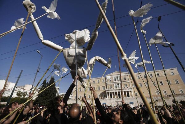 Protesters use a life-size puppet made of paper symbolizing a Greek during an anti-austerity rally in front of the parliament building in central Athens in this November 14, 2012 file photo.JOHN KOLESIDIS/Reuters