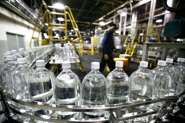 Plastic bottles filled with soda before being labelled are carried on a conveyor belt at Cott’s bottling plant in Toronto.Fernando Morales/The Globe and Mail