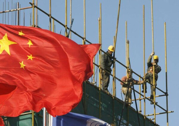 Workers install scaffolding at a construction site as a Chinese national flag flies near by in central Beijing, January 11, 2010.Reuters