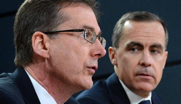 Bank of Canada Governor Mark Carney, right, looks towards Senior Deputy Governor Tiff Macklem during a press conference at the National Press Theatre in Ottawa on Wednesday, January 23, 2013.Sean Kilpatrick/The Canadian Press