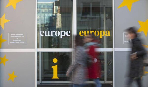 People walk in front of an information office outside of an EU summit in Brussels on Thursday, Nov. 22. Leaders from around Europe are arriving in Brussels on Thursday for what promises to be a turbulent summit on the budget for the 27-country European Union.Virginia Mayo/The Associated Press