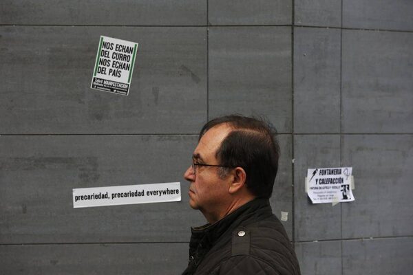 A man waits to enter a government job centre in Madrid April 2, 2013. Spain's jobless rate fell by 0.1 per cent in March from a month earlier, or by 4,979 people, leaving 5.04 million people out of work, data from the Labour Ministry showed on Tuesday. The stickers on the wall read, "Violence is to earn 600 euros" (top L), "Precariousness, precariousness everywhere" (bottom L) and an ad for plumbing and heating repairs.SUSANA VERA/Reuters
